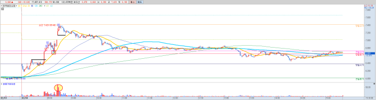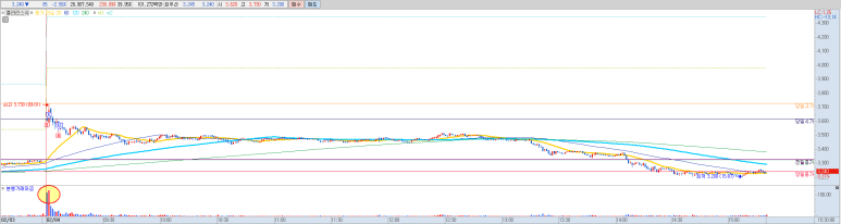 전고를 강하게 돌파할때는 진입하지 못했고, 전일고가를 돌파하면서 여전히지켜주는 모습에 진입 후 짧게 매매하고 나옴. 그 뒤로 강하게 둘렸다가 다시 전고 돌파하면서 상승했고, VI이후로도 버티는 모습에 진입 후 고점인듯 하여 매도하고 나옴.